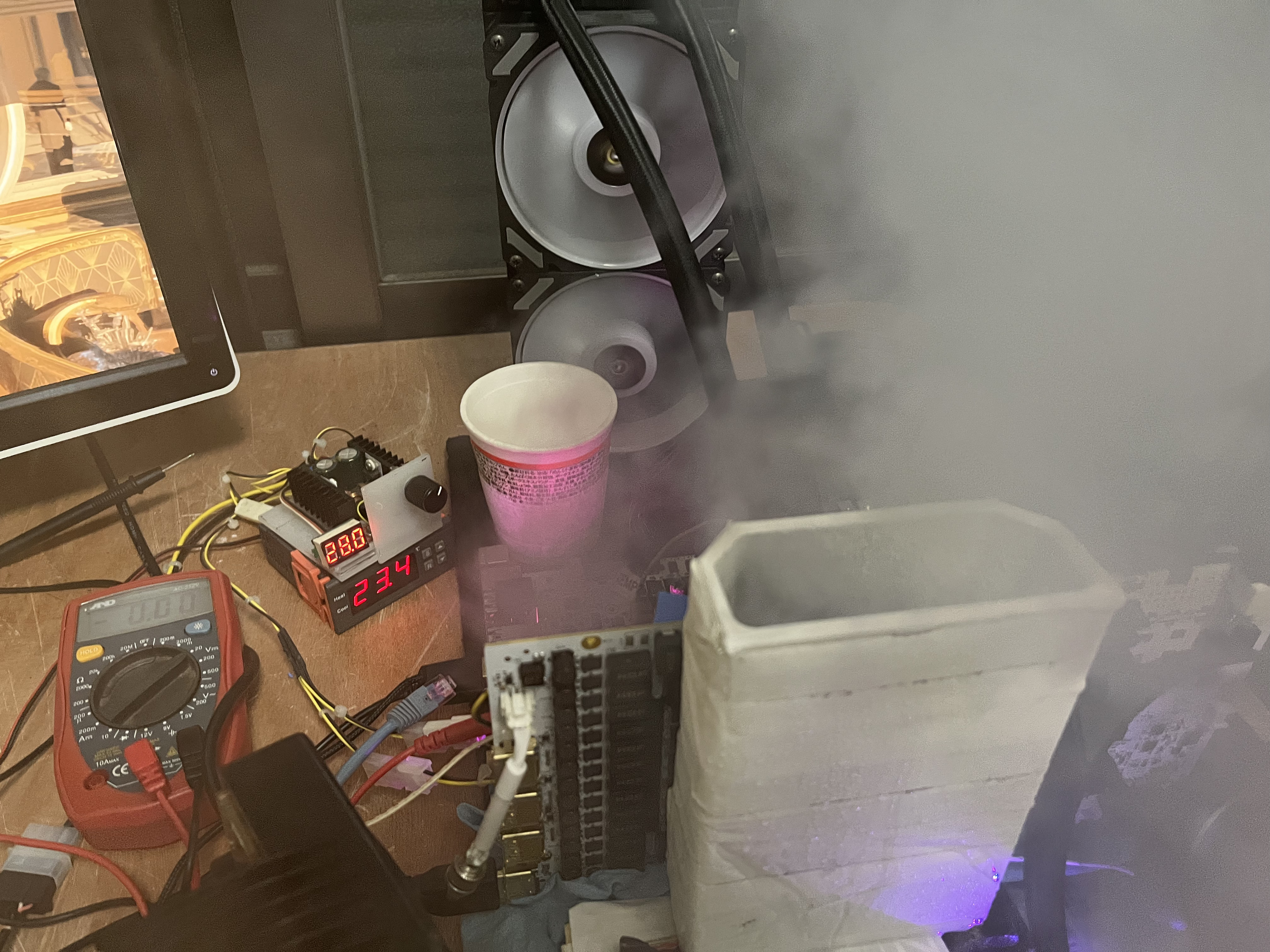 最近は極冷でも要求電圧は下がっていてVcoreは0.8~1.1v ,メモリは1,2vで十分なのですが、結露が発生しどこか短絡してくると急に強烈な電圧になっている事もあるからです。